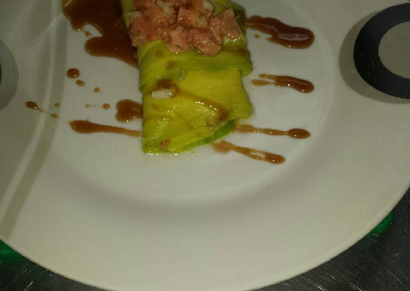 - Encima de la cama de aguacate le echarás el salmón, y los vegetales cortados, luego los envuelves hasta que quede en cilindro lo montas en un plato y le echas para decorar vinagre balsámico o soya glasé.