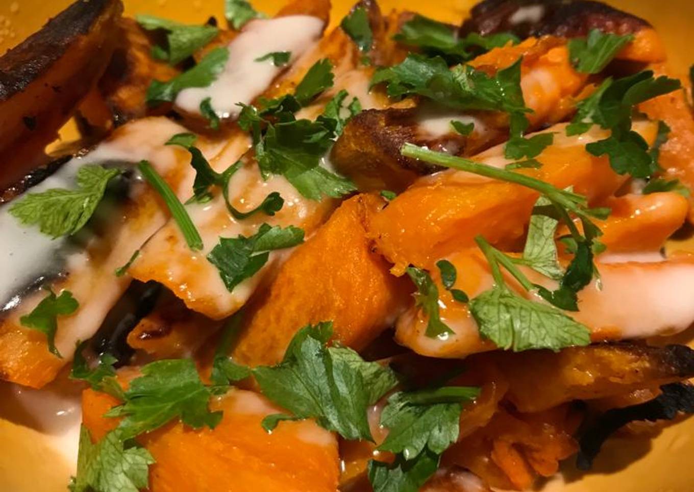 Llevar al horno por 20 minutos aprox o hasta dorar. Sobre las batatas, agregar el ali oli y perejil.