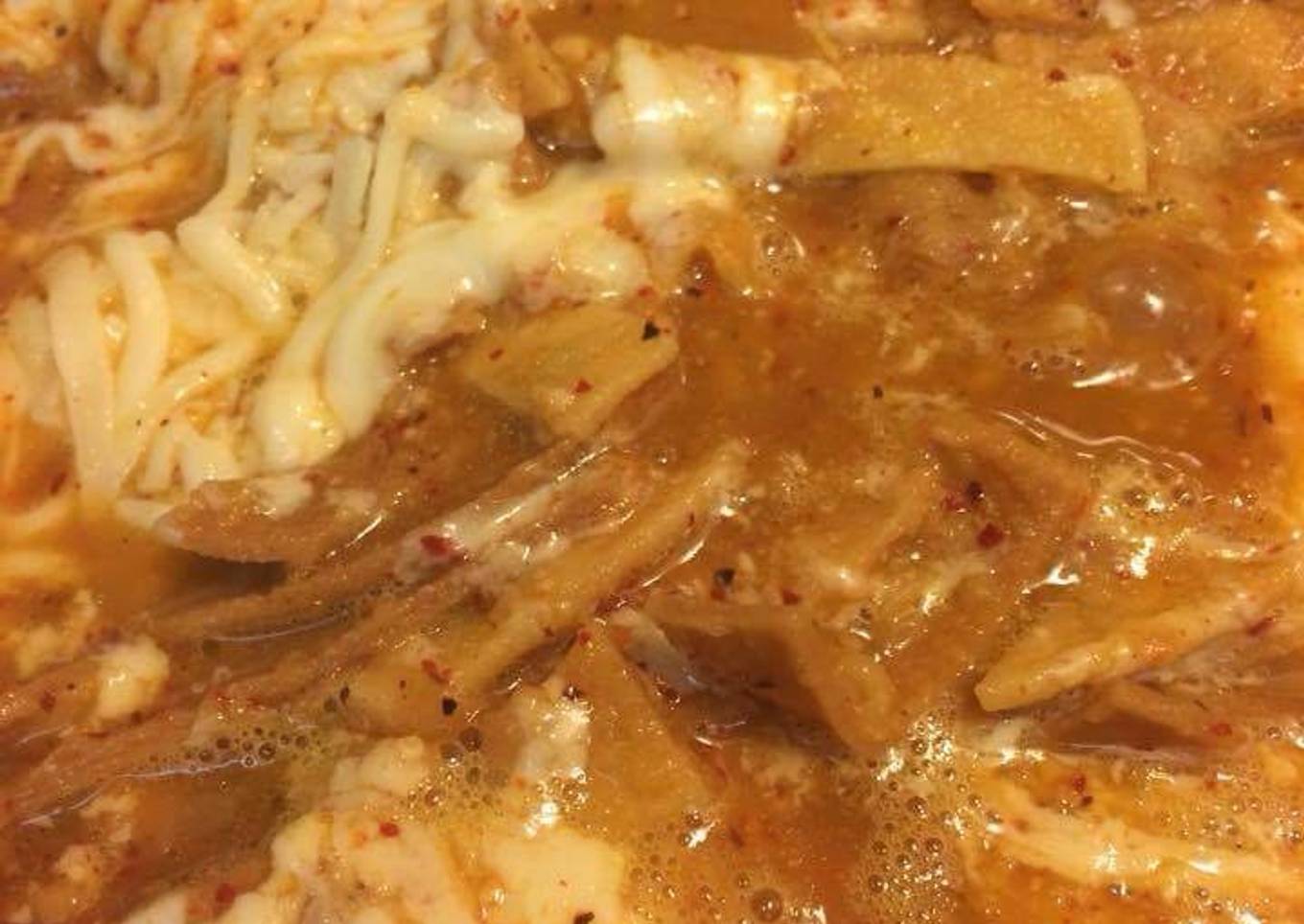 - En una cacerola grande se pone la salsa, a fuego alto reduciendo a mediano, cuando comience a hervir. Se agregan las tostaditas y se le pone la cebolla picada y se mezcla, por último los quesos hasta que se comiencen a fundir y se apagan.