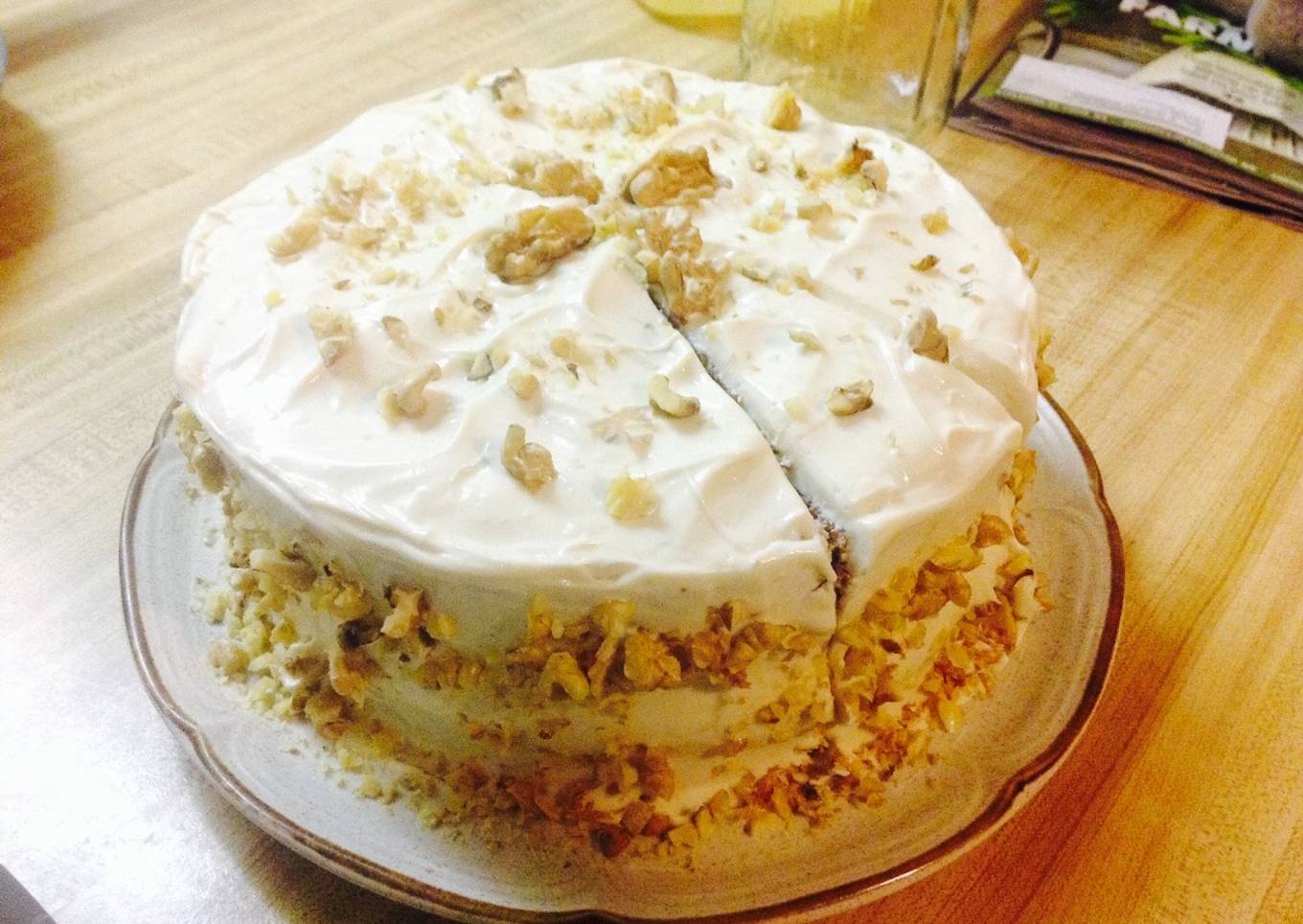 - Y procede a decorar tu paste. Esta receta da para un pan grueso, que puedes partir en dos. Y agregar entre cada capa, crema. Yo preferí así... Y picas tu walnut (nuez) y decoras a tu gusto.