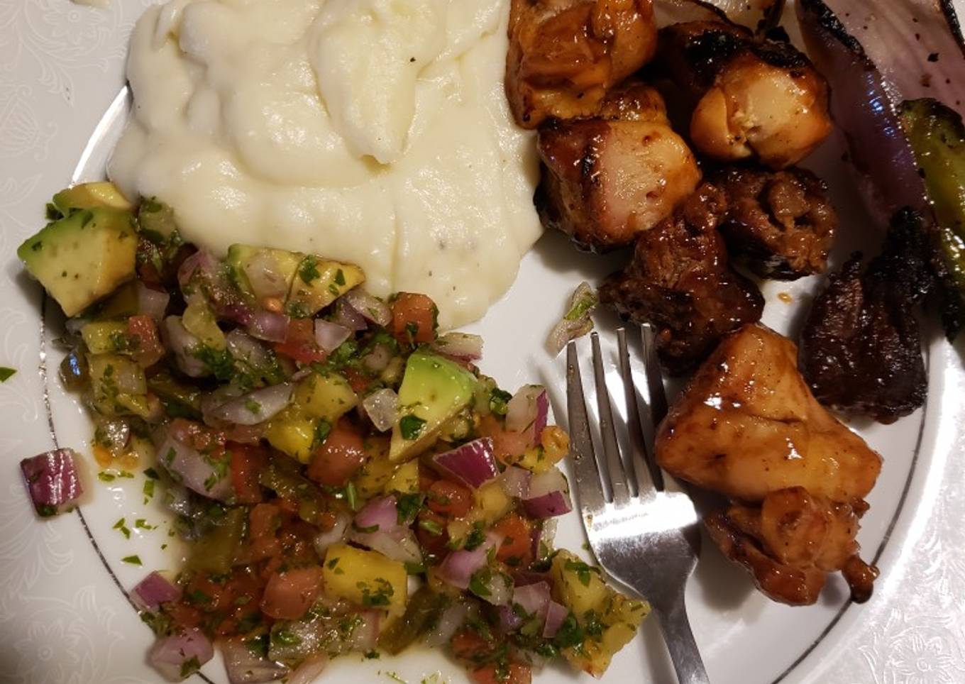 Pico de gallo de piña con aguacate pinchos de pollo y puré de papa