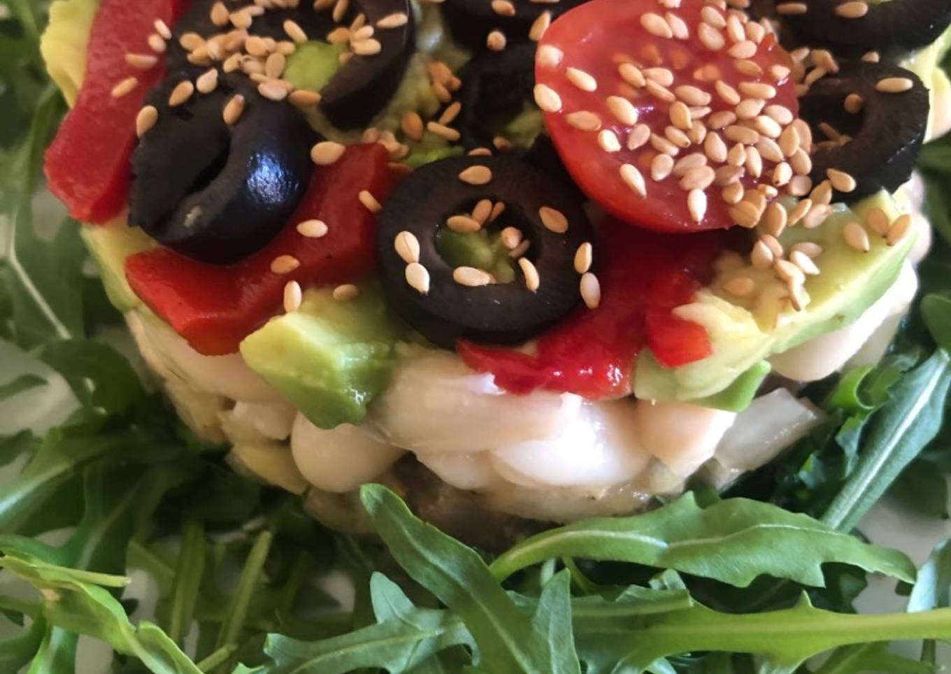 - Ponemos el molde. En la base en atún y cebolla marinado, después las alubias, encima una capa de aguacate, encima unas tiras de pimiento y aceitunas y unos tomatitos cortados.