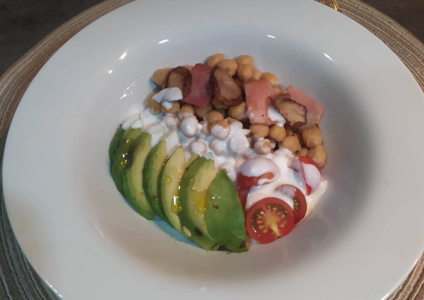 Garbanzos salteados con panceta, cherrys, aguacate y salsa yogur