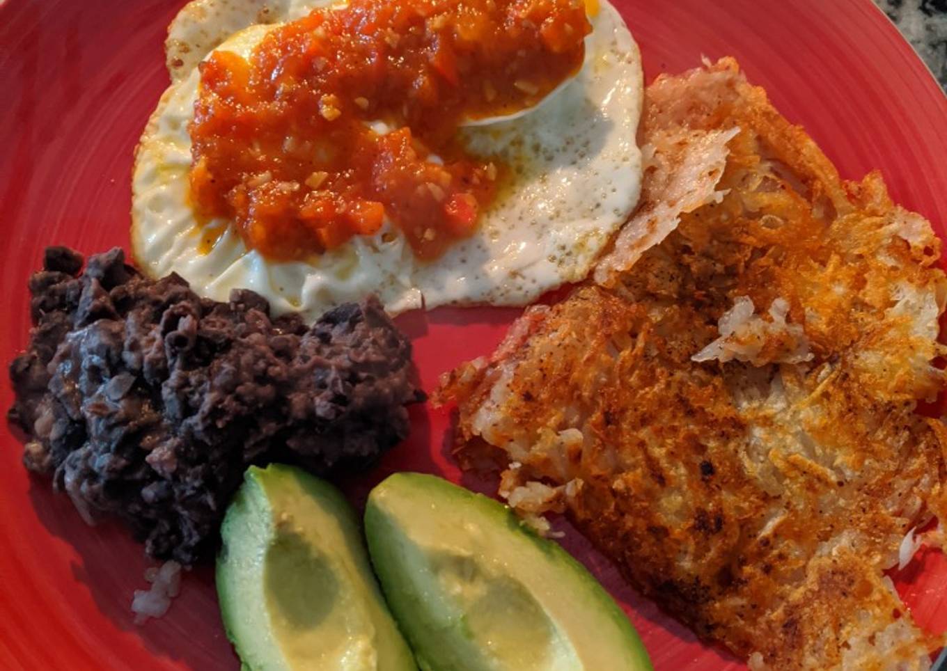 En la foto van unos huevos fritos con un pisto de tomate, pimentón rojo y ajos, frijoles negros refritos y 1/2 palta o aguacate.
