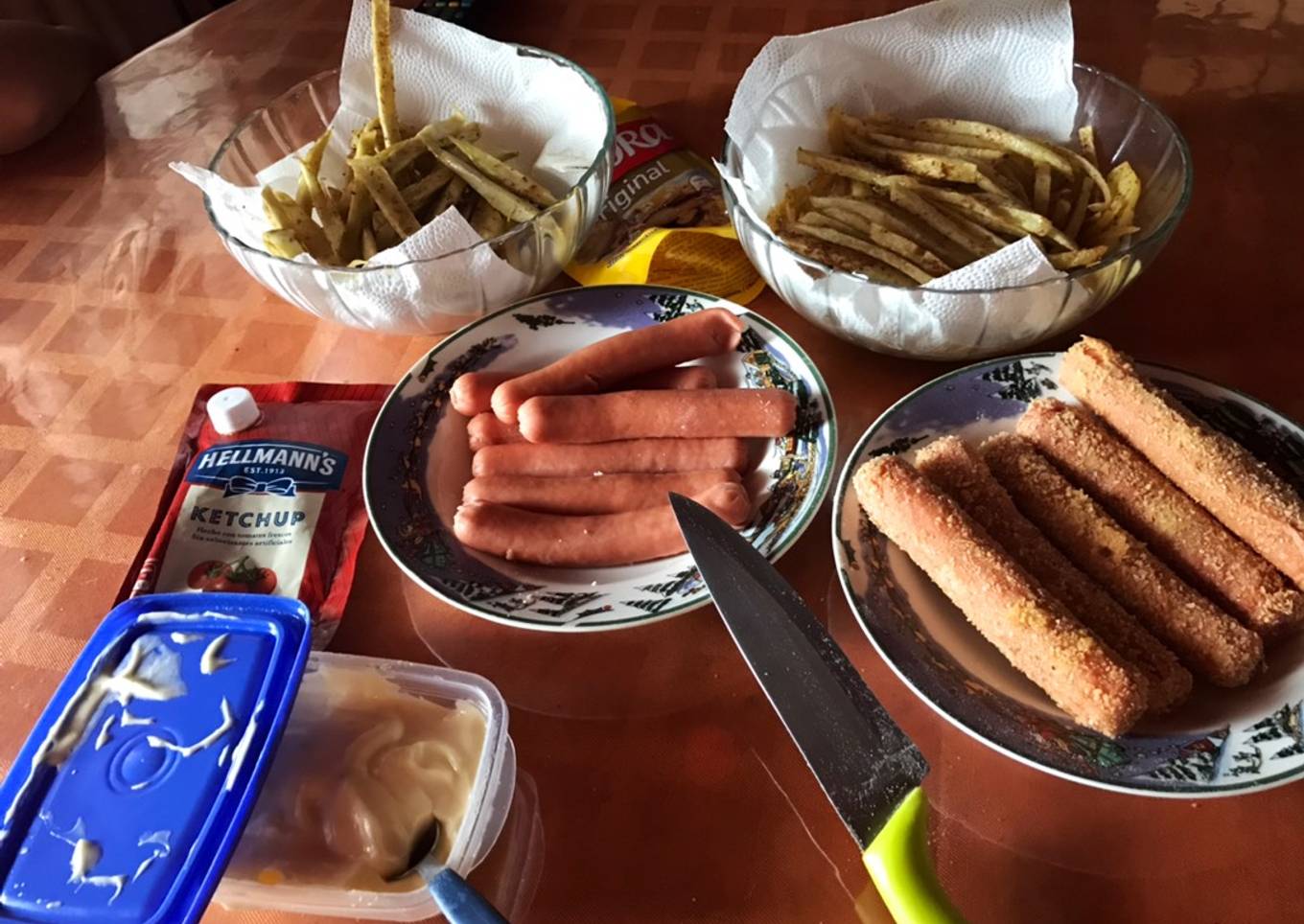 #MiRecetario. Hoy un feriado entre mis hijos y yo, la madre al trabajo (se llevó la receta anterior filete rellenos) o sea quedamos sin control, y decidimos darle a las salchichas tradicionales y rebozadas con papas y batatas fritas, una locura abundantes mayonesa casera, savora y ketchup, que Dios nos perdone, estuvo de rechupete