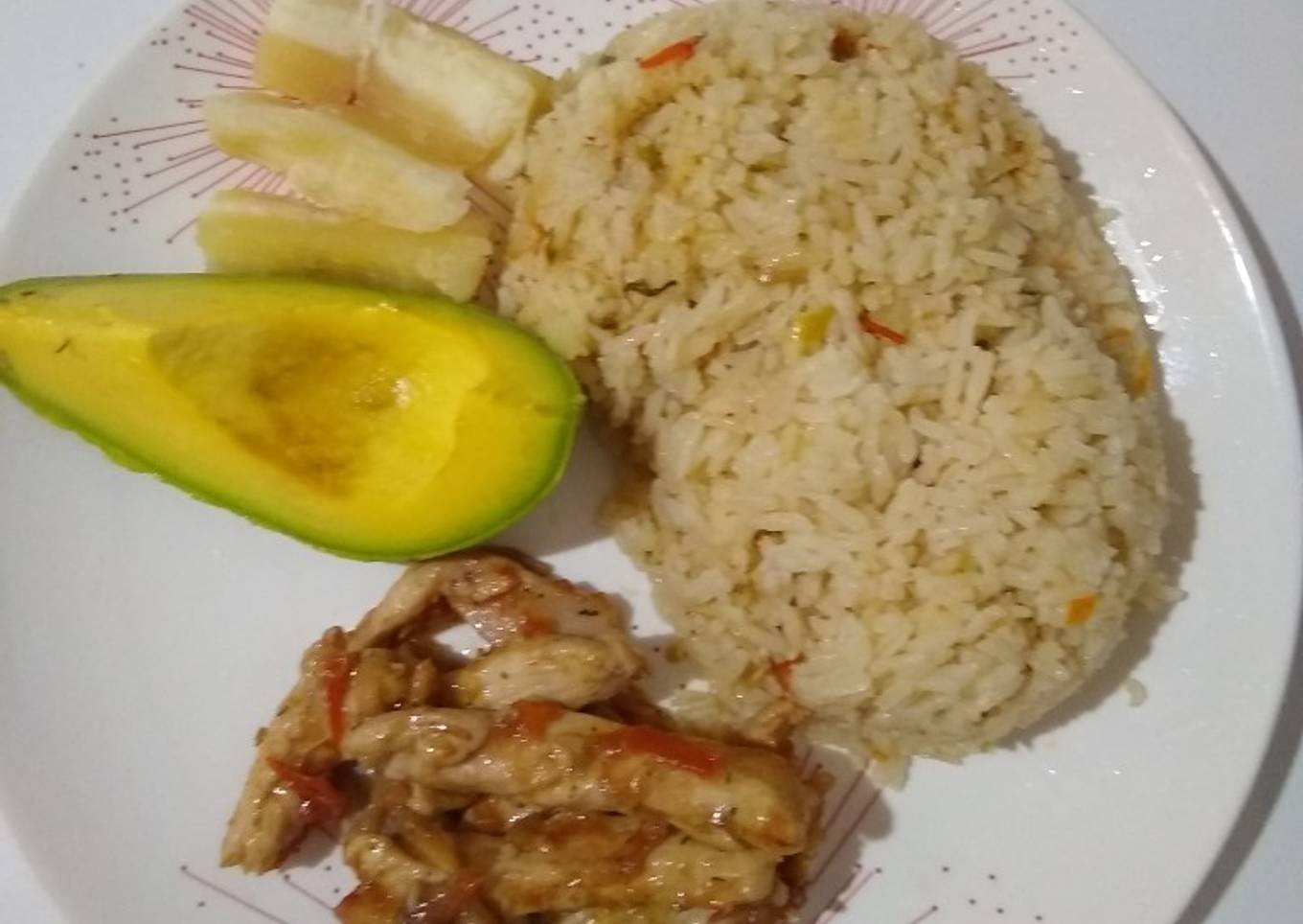 Pollo con vino tinto, aguacate, yuca y arroz con pimentones