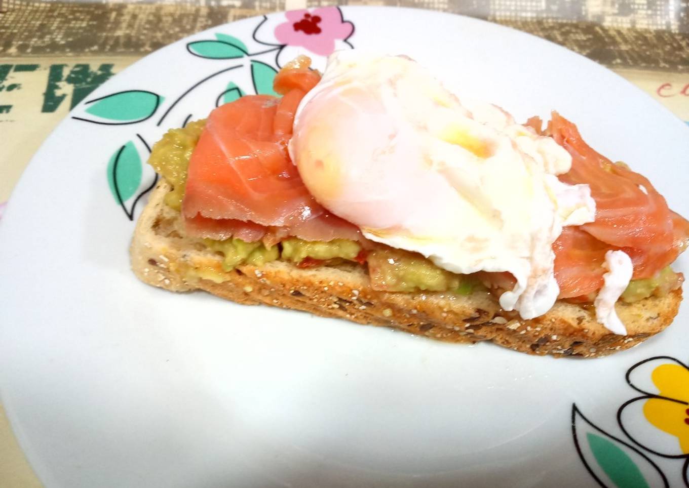 - Tostar el pan al gusto, extender la mezcla del aguacate con tomate y poner encima una loncha de salmón ahumado. Colocar encima el huevo poche y terminar regando con un hilito de aceite.